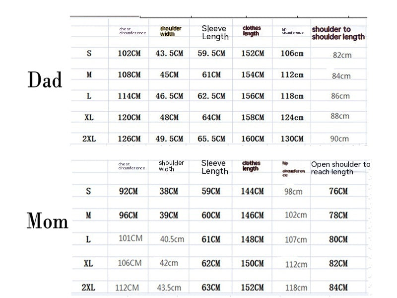 Suitable height: Dad-S,Dad-M,Dad-L,Dad-XL,Dad-2XL,Mom-S,Mom-M,Mom-L,Mom-XL,Mom-2XL,Kid-2T,Kid-3T,Kid-4T,Kid-5T,Kid-6T,Kid-7T,Kid-8T,Kid-T9, kid-11T, Baby-3M,Baby-6M,Baby-9M,Baby-12M,Baby-18M